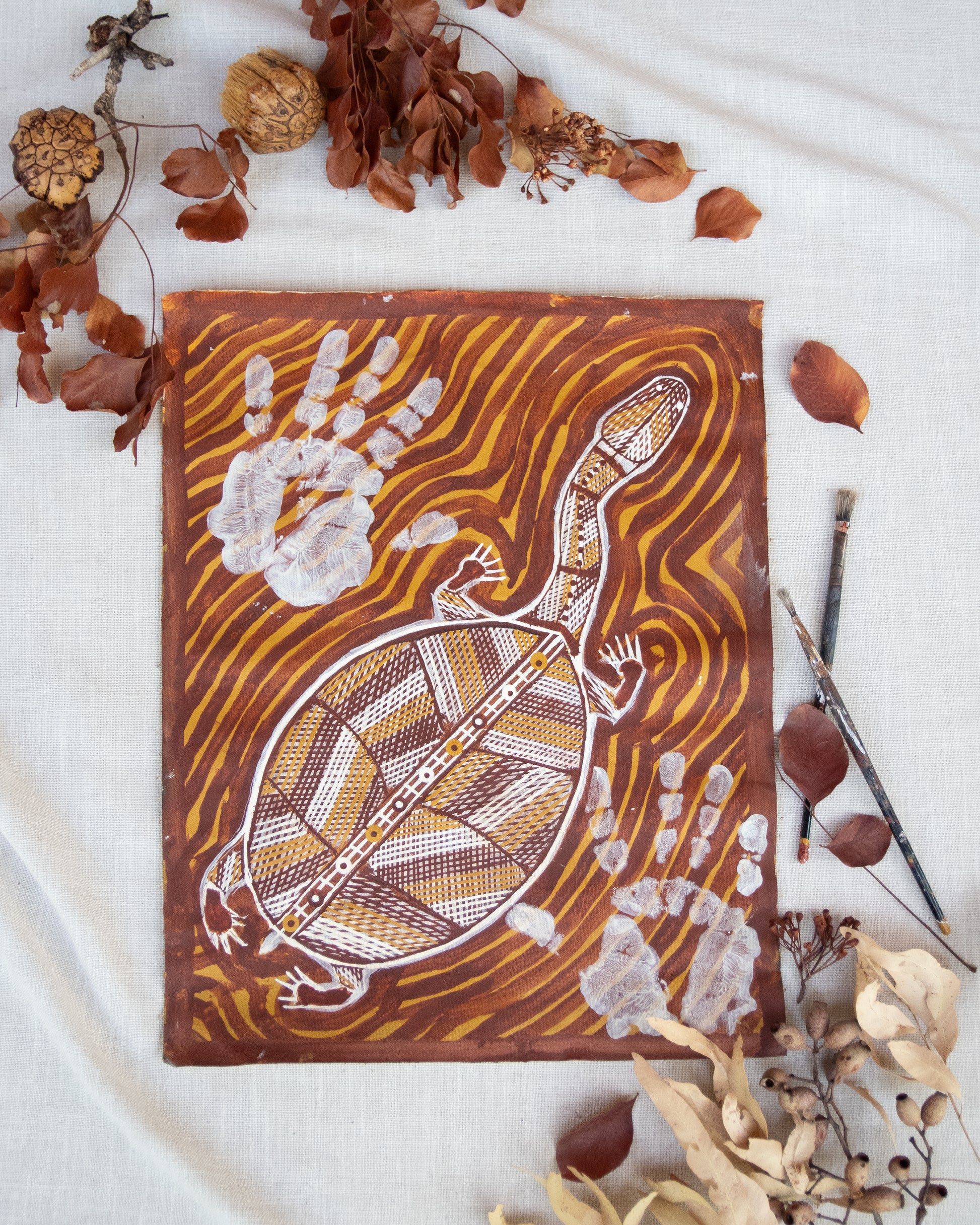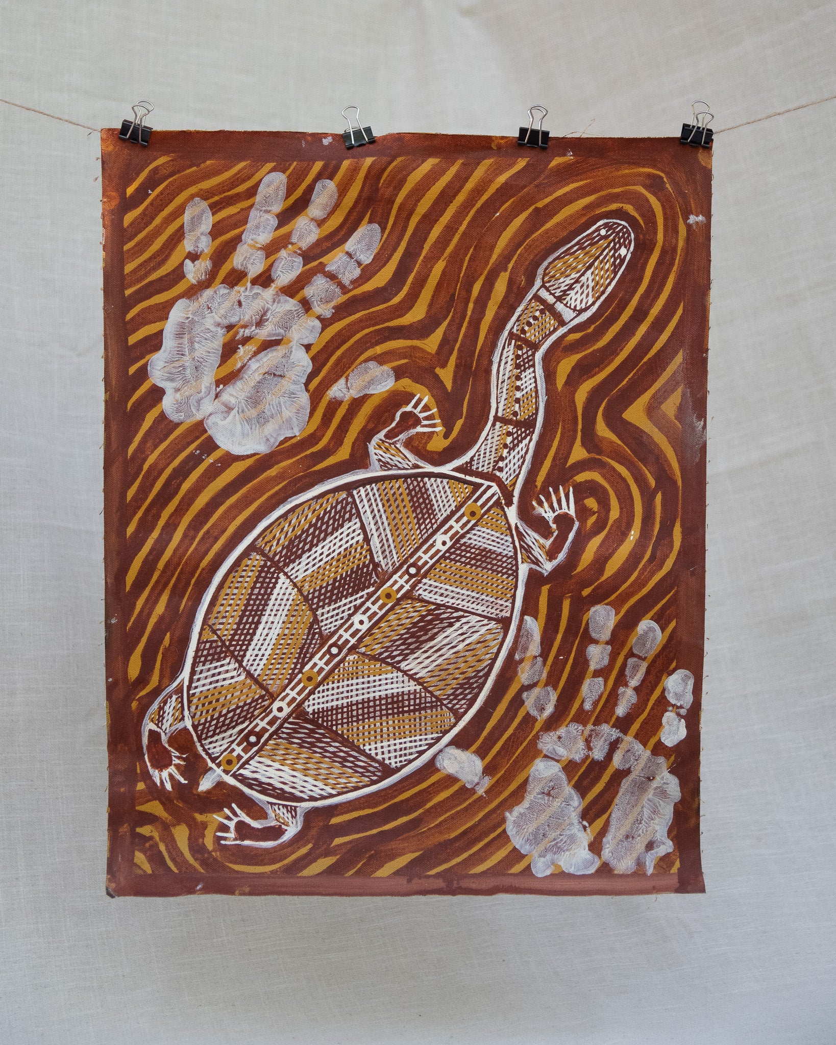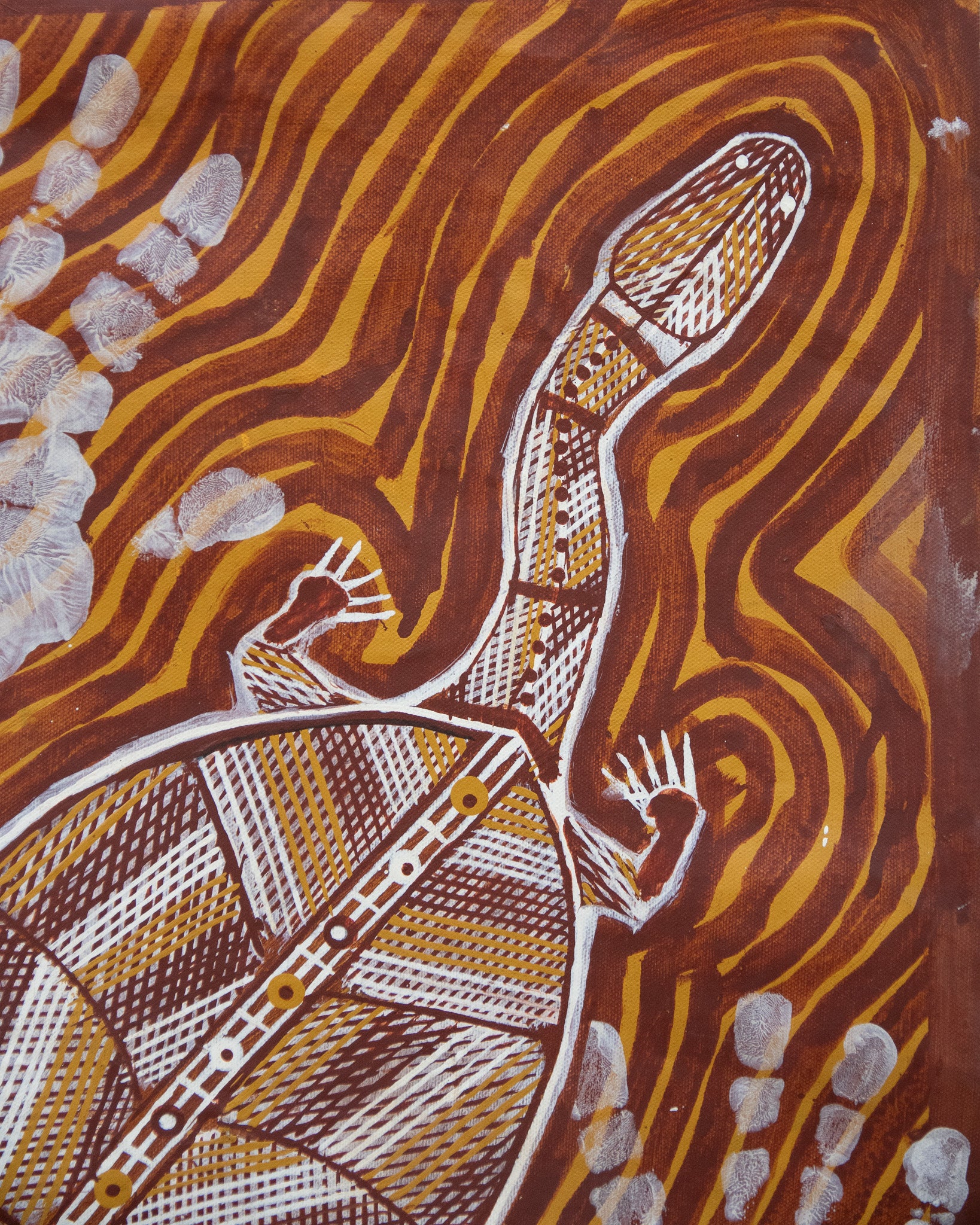 Ngalmangiyi (long neck turtle), is commonly found in the waterways of Kakadu and north Arnhem land. The long neck turtle plays a role in the traditional food sources of the indigenous communities. For generations, the Bininj/Mungguy people have relied on sustainable hunting and gathering practices, and the turtle's meat is considered a delicacy. Traditionally hunting for turtles was more likely women’s business, they would go to the floodplains with long sticks and poke them against the ground. You would then carefully listen for when you managed to hit a shell, this is the time to start digging.