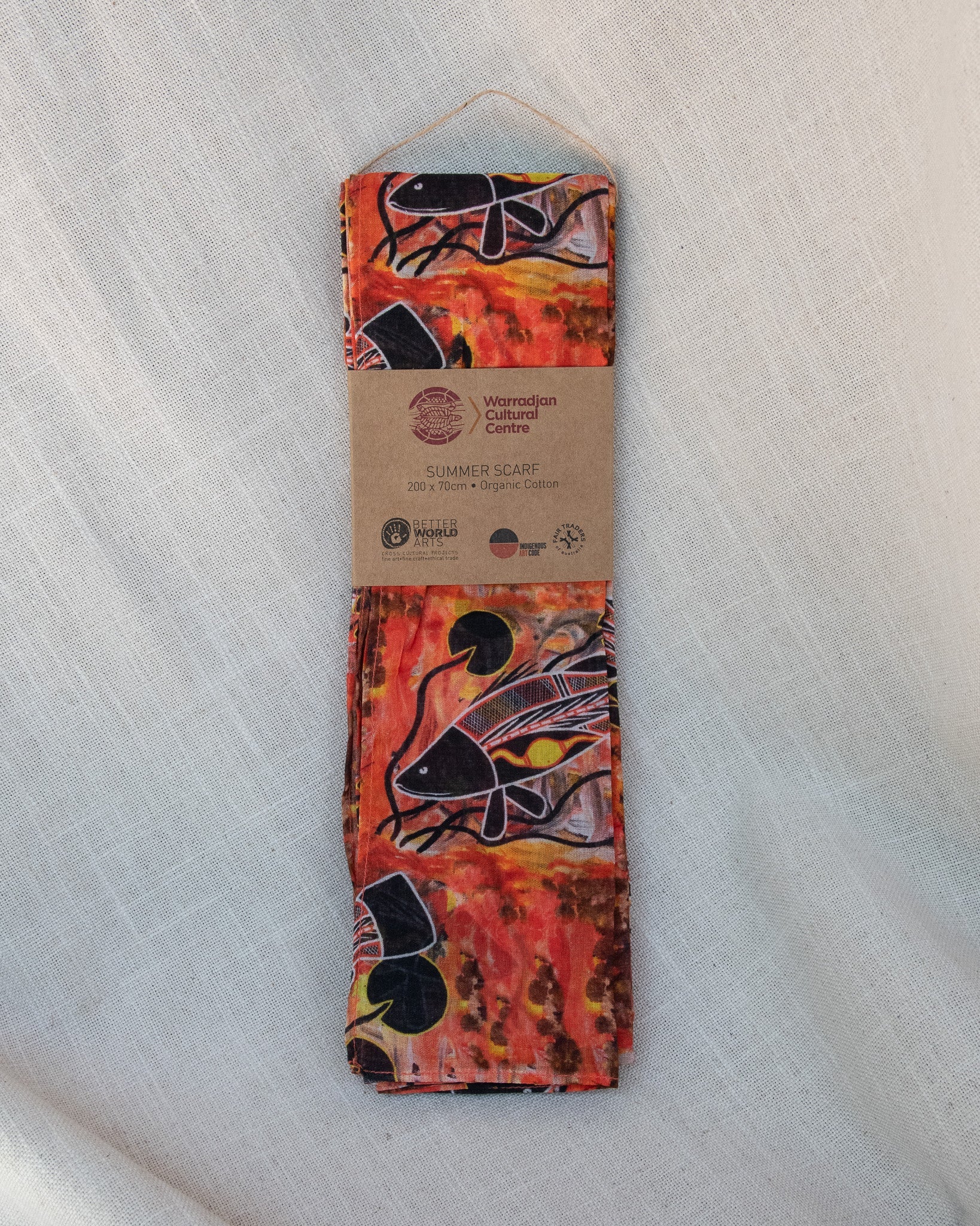 Organic Cotton Summer Scarf featuring Barra Artwork from Aboriginal Artist Jacqueline Cahill.